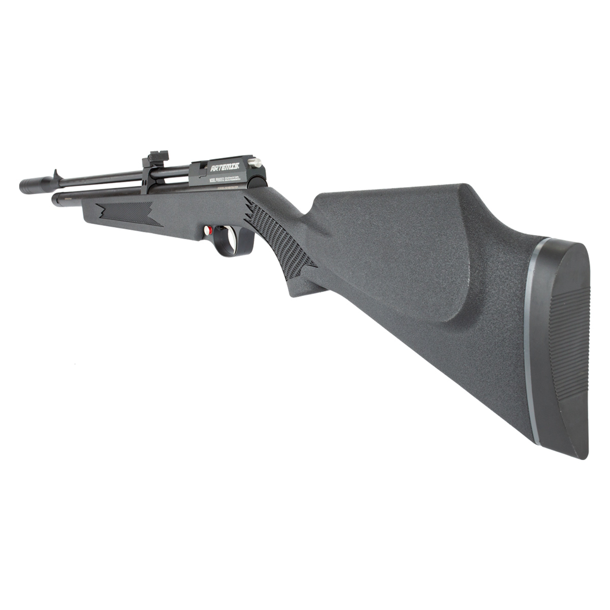 Possui gatilho ajustável em metal na cor prata que dá um destaque visual muito bonito para essa carabina preta Artemis.