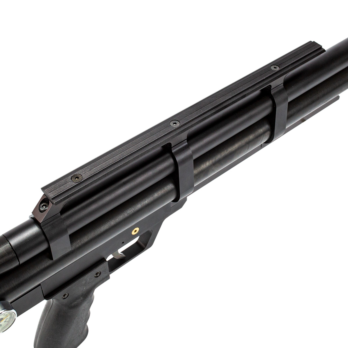 O sistema de engatilhamento da Carabina PCP Custom é por alavanca lateral (Side Lever) e o modo de disparo é Multishot. Acompanha um magazine rotativo com capacidade para 10 chumbinhos 5.5 mm.