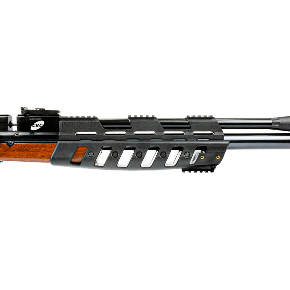 Carabina CBC com Trilhos picatinny de 20mm compatível com diversos acessórios, como mira, lanterna, bipé, etc. Os trilhos estão localizados na parte superior, lateral e inferior.