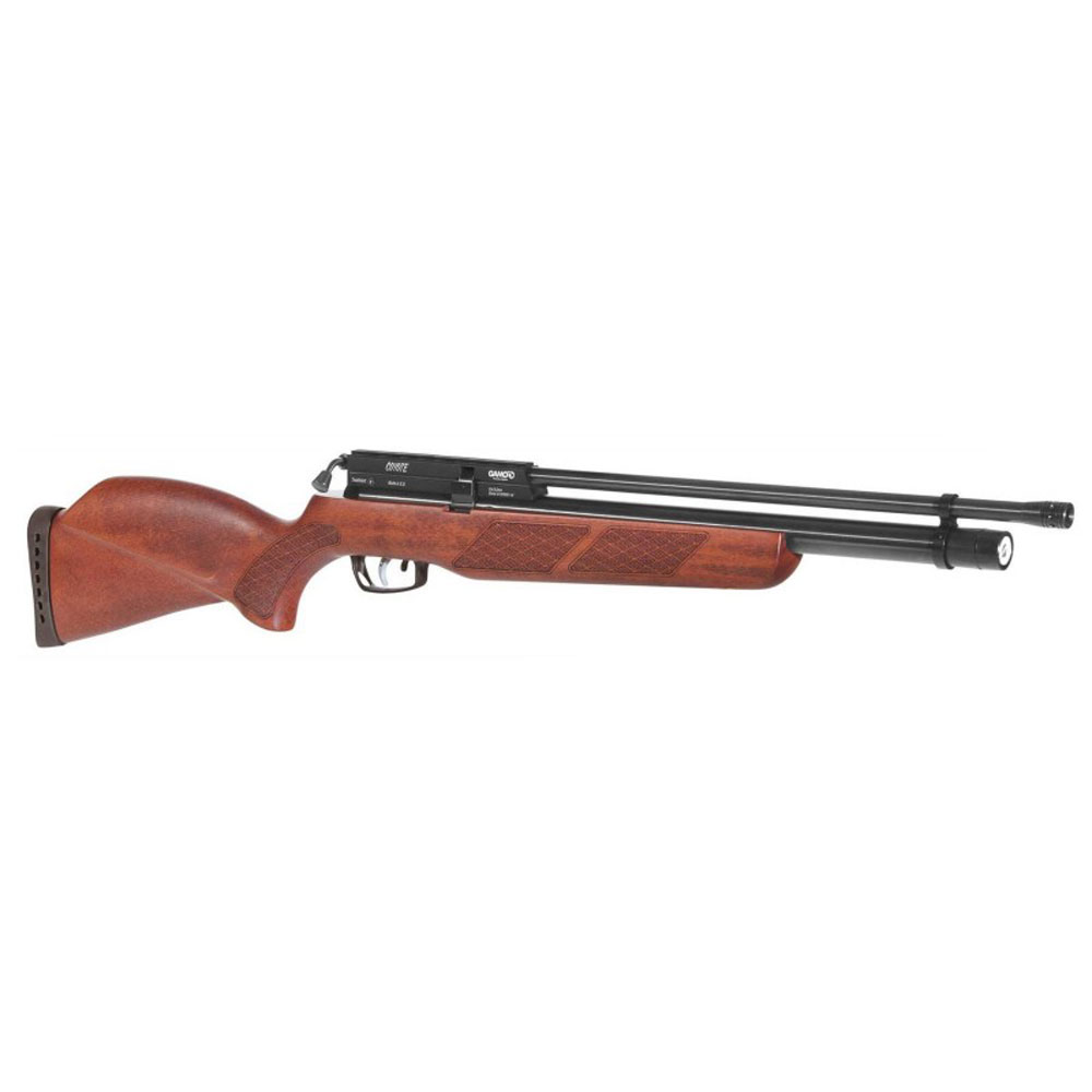 Possui coronha de madeira ambidestra, estilo caçador, com verniz à base de água com afiação de borracha., é uma linda Carabina Gamo para você que deseja muita precisão e potência!