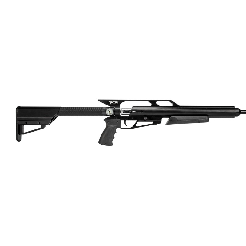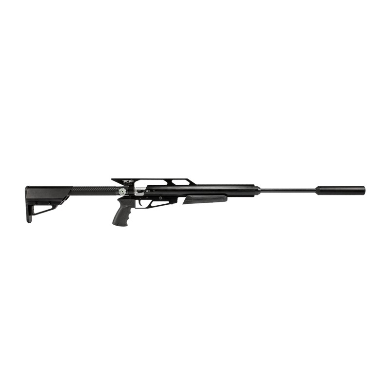 Uma Carabina PCP com visual moderno e diferenciado que acompanha um supressor de ruídos na cor preta.