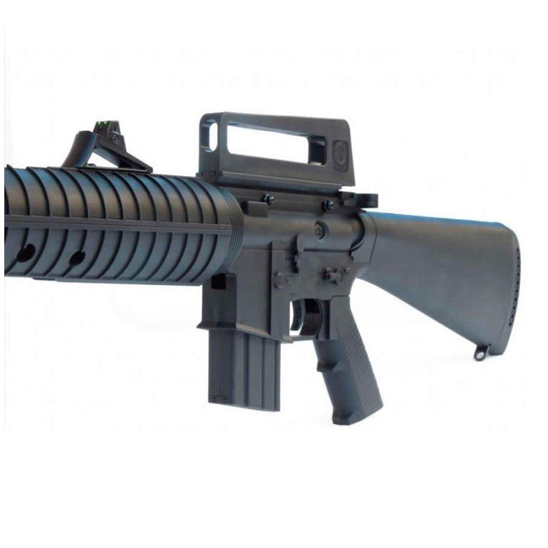 Rifle de Pressão M16-S possui ação por mola helicoidal com engatilhamento por basculamento do cano, seu cano possui acabamento em polímero e coronha em polímero do tipo tática, ambidestra.