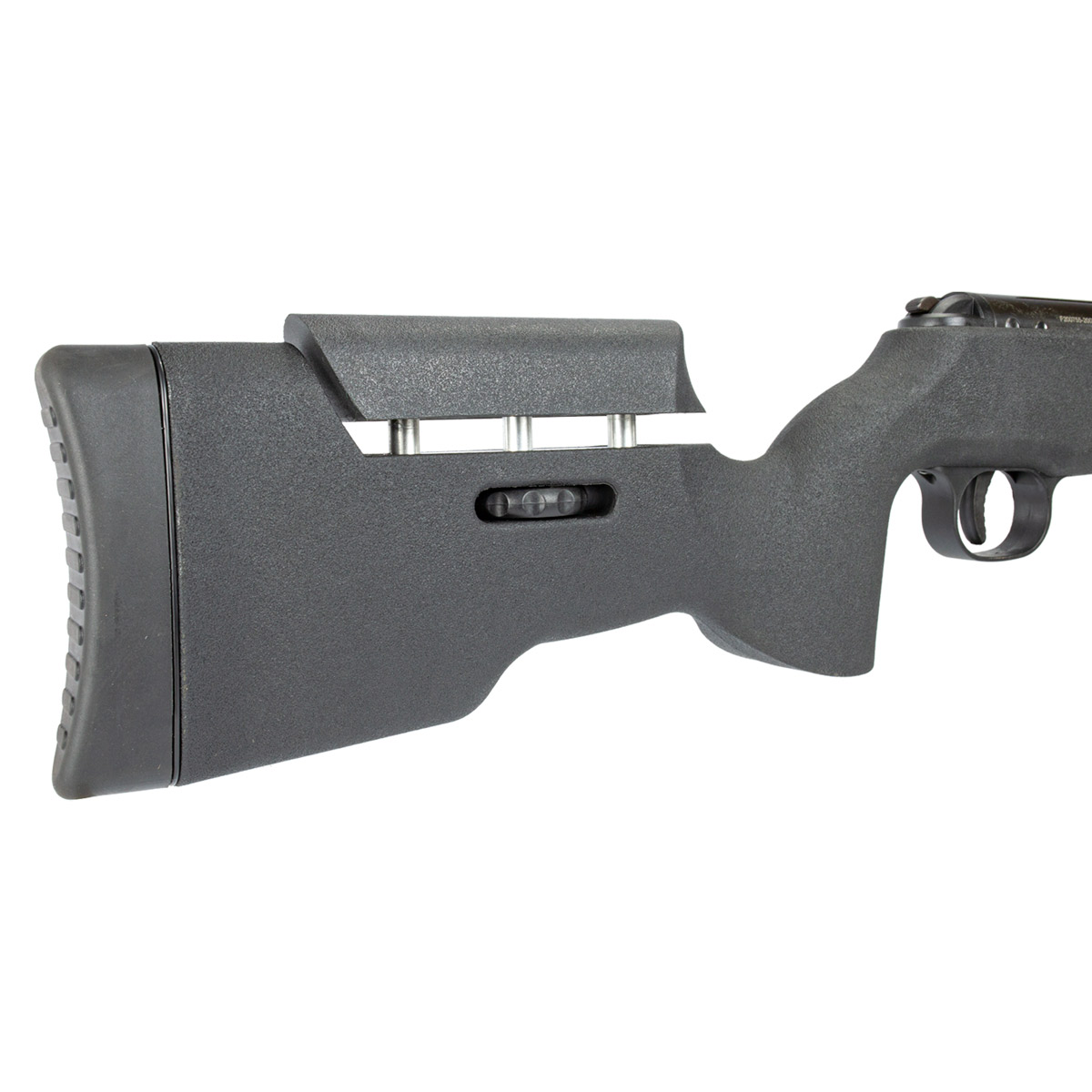 Sua coronha além de ter uma soleira emborrachada possui um apoio de bochecha regulável.
