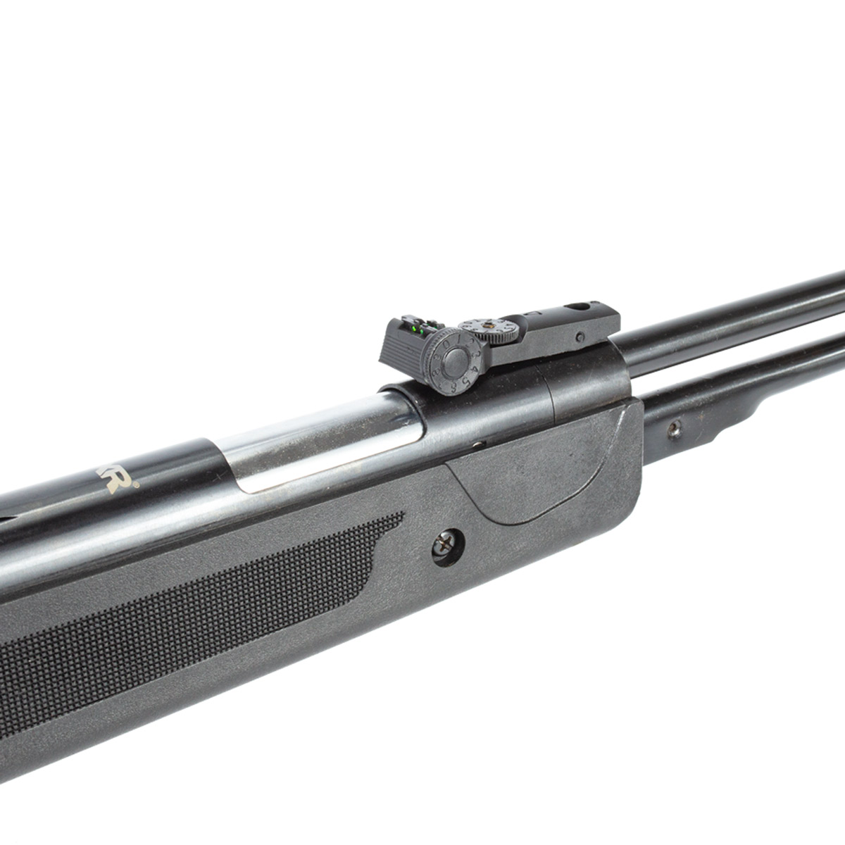 Sua alça de mira conta com regulagem micrométrica (vertical e horizontal) e fibra óptica verde, enquanto sua massa de mira é fixa e conta com túnel de proteção e fibra óptica vermelha.