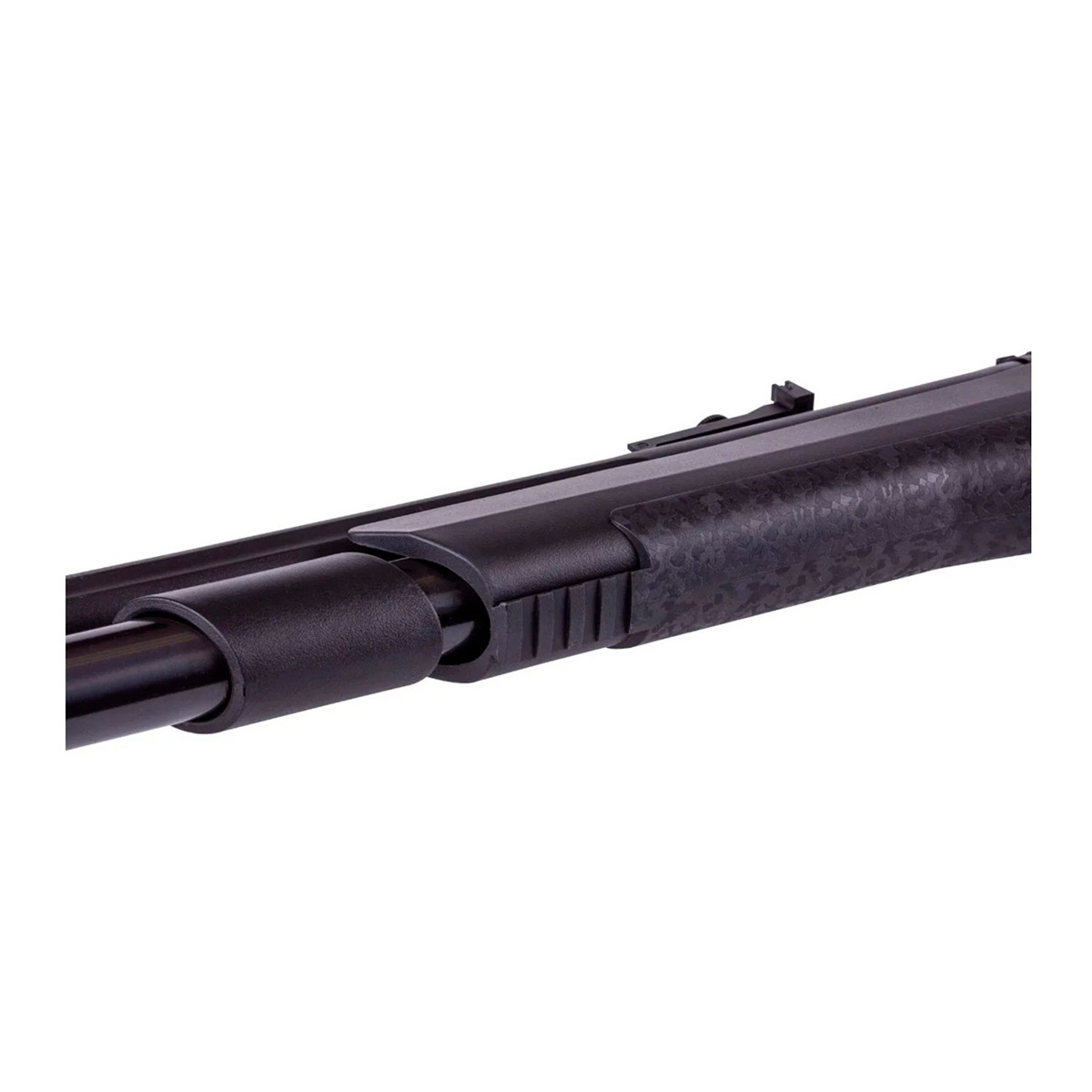 Sua coronha sintética texturizada oferece pegada firme e ergonomia confortável, enquanto a soleira emborrachada contribui para maior estabilidade no apoio ao ombro.