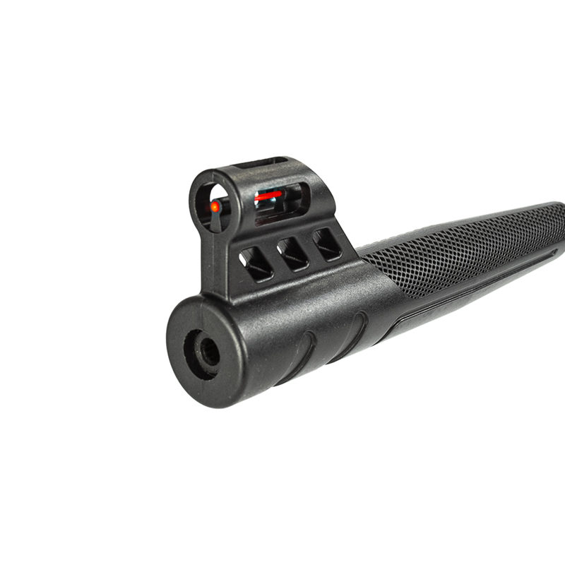 A alça e massa de mira da carabina são feitas em fibra óptica e ajustáveis. A massa de mira possui um túnel de proteção.