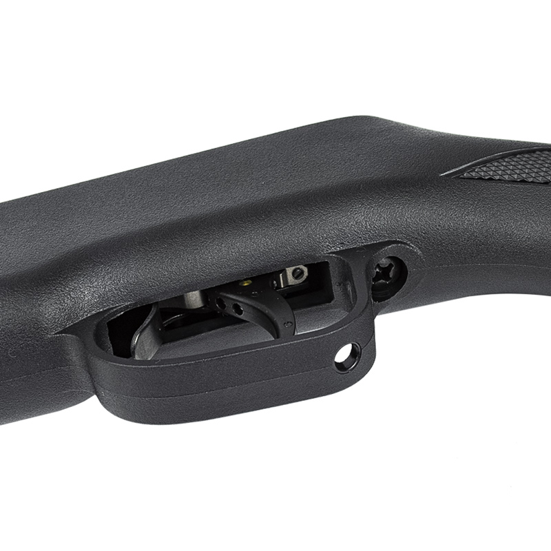 Uma carabina com coronha monte carlo que tem um design tradicional muito bonito na cor preta com detalhes texturizados na lateral e na empunhadura.