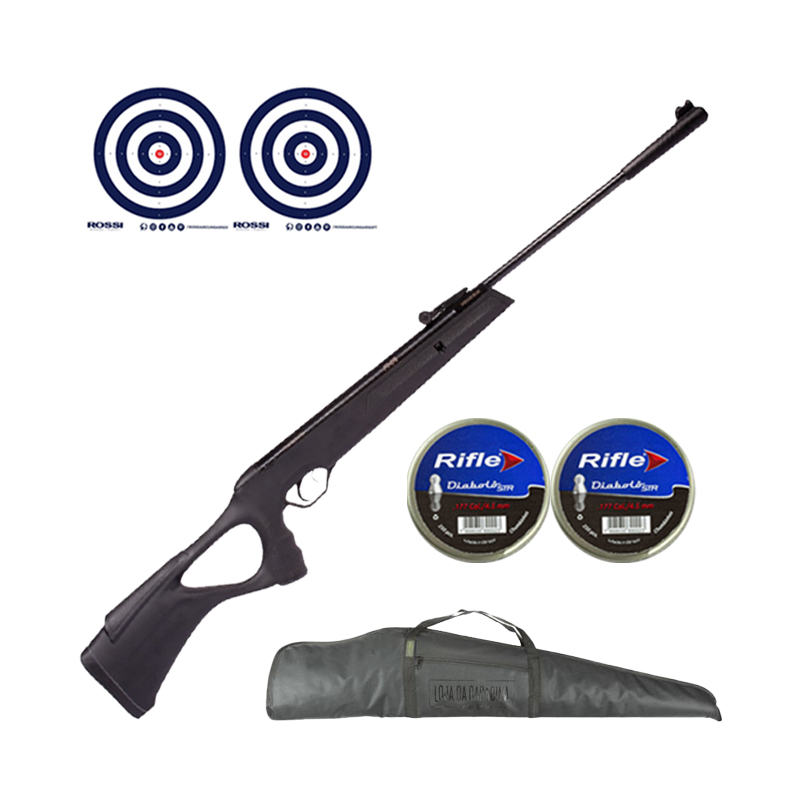 Super KIT com ótimo custo benefício, conta com Capa Universal LC 120cm para armazenar seu equipamento com segurança, Chumbinhos Rifle Diabolô 4.5mm para municiar sua gás ram e Alvos de Treino Rossi.