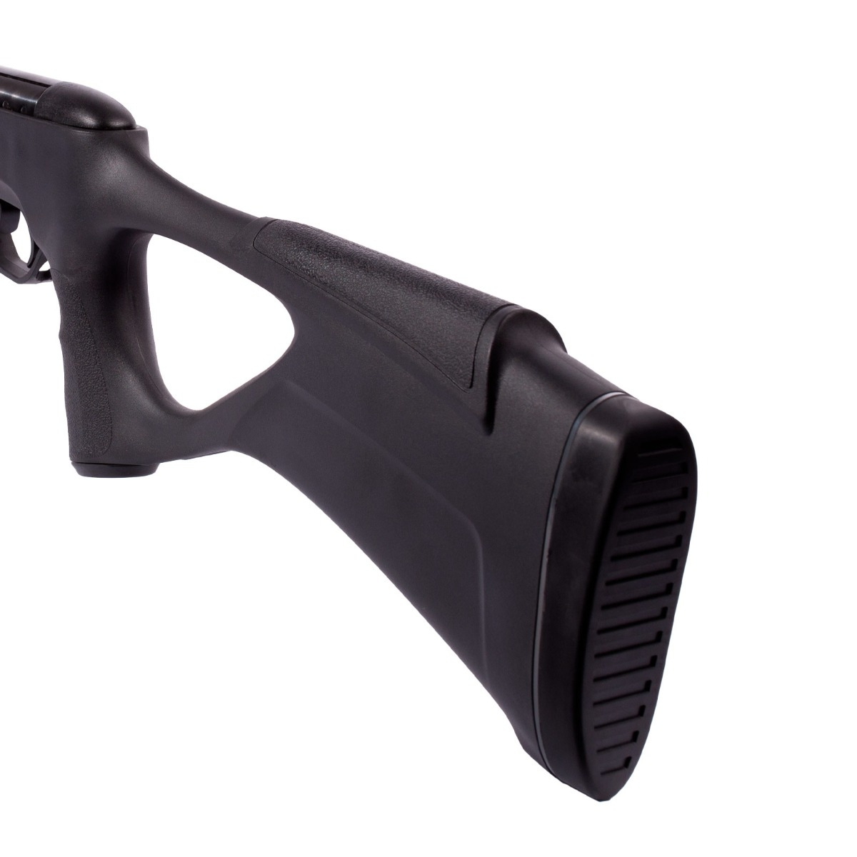 Coronha tática thumbhole em polímero de alta densidade na cor preta que oferece manuseio facilitado e maior conforto ao atirador.