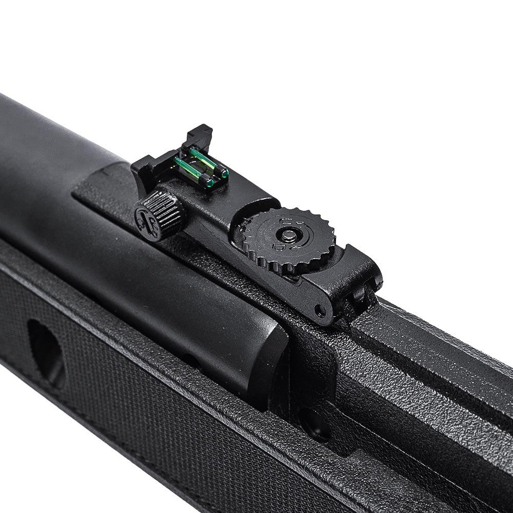 Equipada com conjunto de mira aberta com fibra óptica, facilitando a visada do alvo mesmo em ambientes com baixa luminosidade.