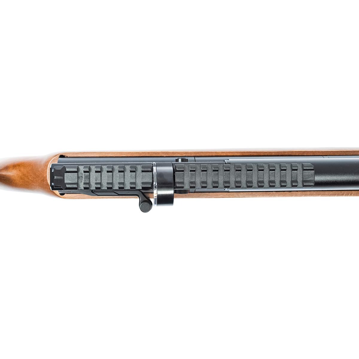 O engatilhamento é realizado através de alavanca lateral estilo biathlon, proporcionando operação rápida e suave, ideal para disparos consecutivos com maior fluidez.