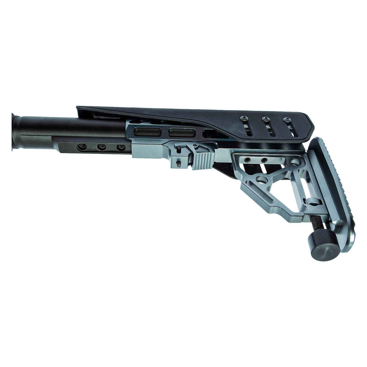 Sua estrutura é construída com componentes usinados em CNC, garantindo excelente acabamento, resistência e durabilidade. O design moderno inclui coronha tática dobrável, que facilita o transporte e o armazenamento, além de proporcionar melhor ergonomia durante o uso.