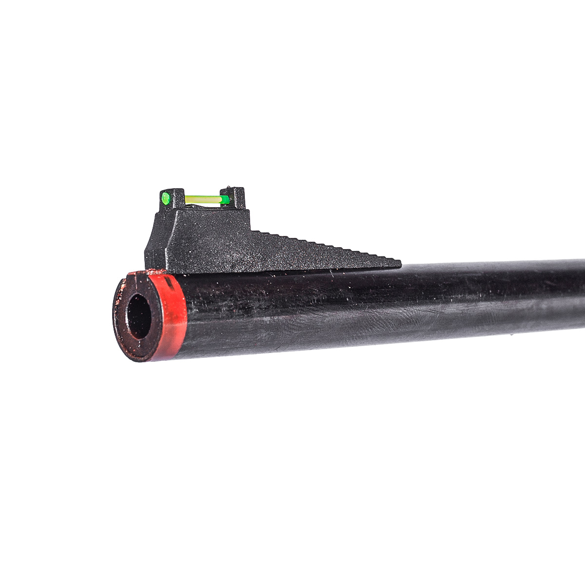 Possui conjunto de mira aberta instalada, sendo a alça de mira ajustável e a massa de mira fixa com fibra óptica verde.