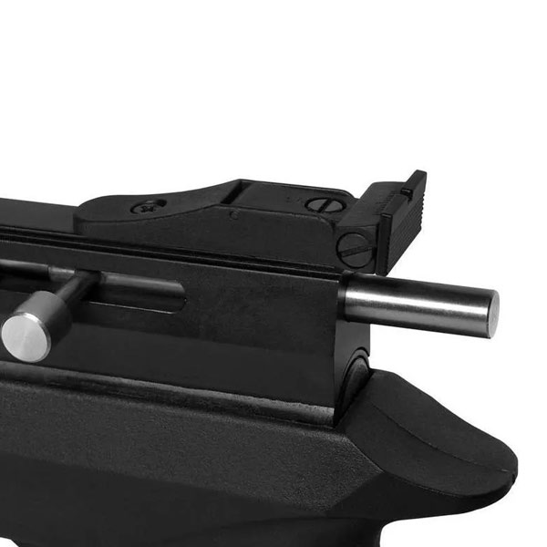 O engatilhamento é por um ferrolho em metal, localizado na lateral, você vai conseguir disparar, sem muito esforço.