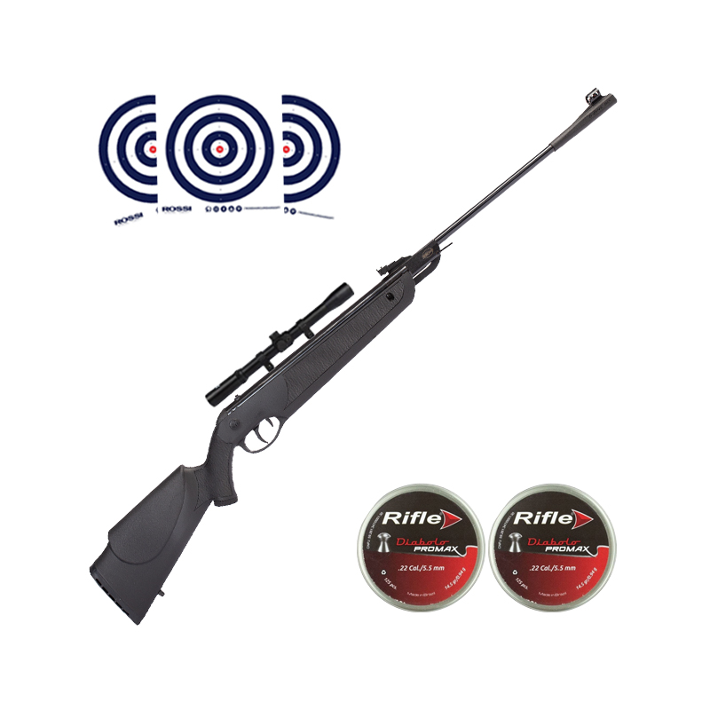 Combo completo criado pela LojaDaCarabina! Acompanha Luneta 4x20 Thunder Outdoors para aprimorar seu desempenho de mira, Chumbinhos Rifle Promax para municiar sua carabina e Alvos de Treino Rossi.