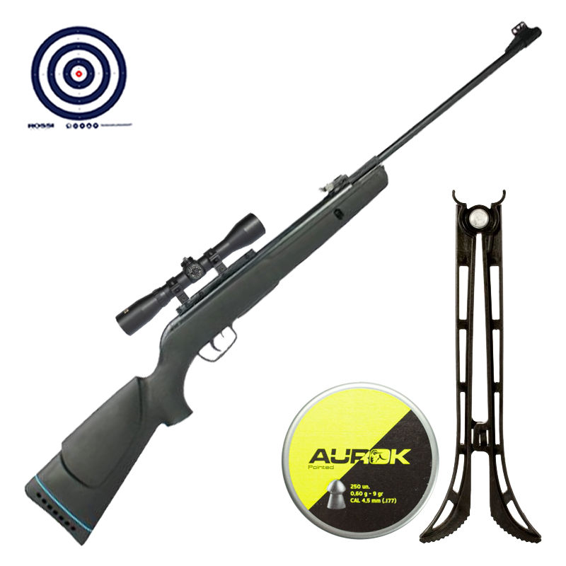 Combo feito pela LojaDaCarabina contendo Luneta Rossi 4x32 Sport para melhor visada do alvo, Chumbinhos Aurok 4.5mm para municiar sua carabina, Bipé para Carabina para que você estabilize sua arma e melhore a precisão dos seus tiros e Alvos de Treino Rossi.