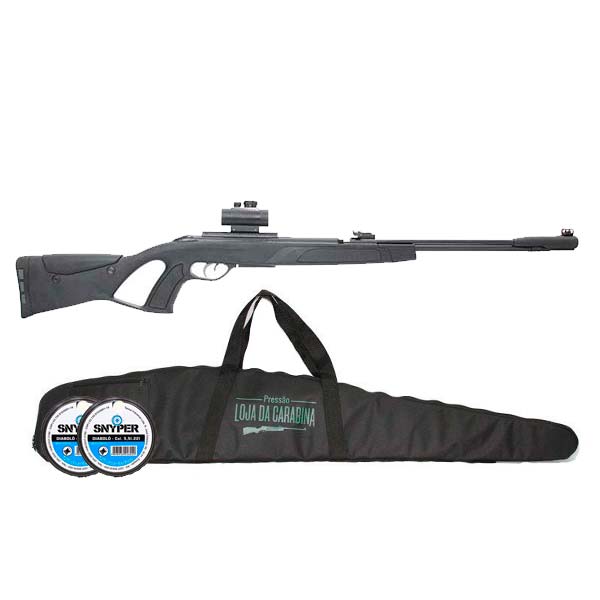 Acompanha duas latas de chumbinhos Snyper para calibre 5.5mm(.22) e uma Capa para transporte fácil e prático da sua carabina!