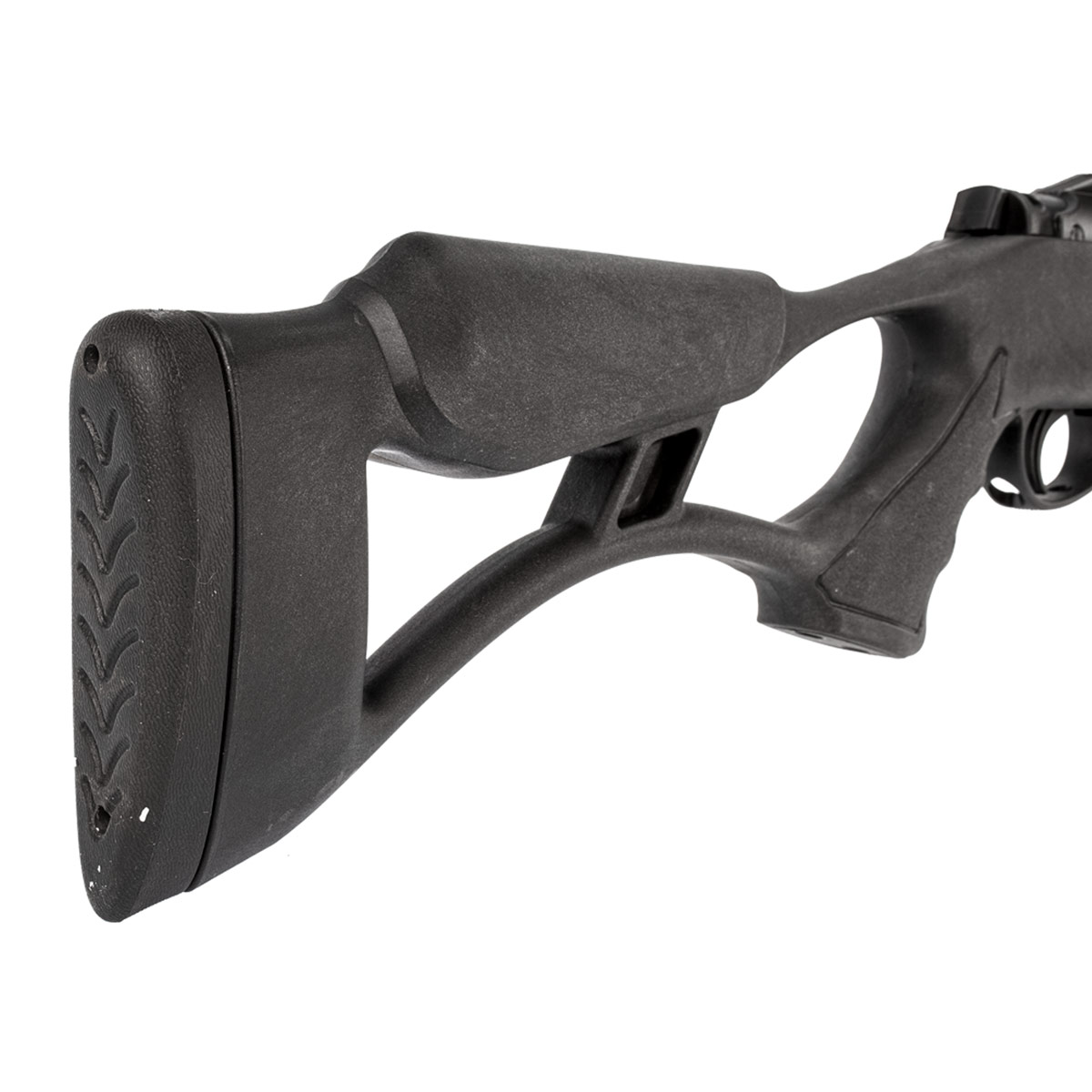 Possui soleira emborrachada que amortece o recuo, tornando o uso da carabina mais confortável.
