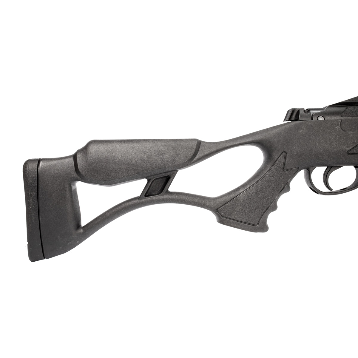 Padrão thumbhole com partes vazadas. Desse modo você consegue uma pegada mais firme durante os disparos, além de deixar a carabina um pouco mais leve.