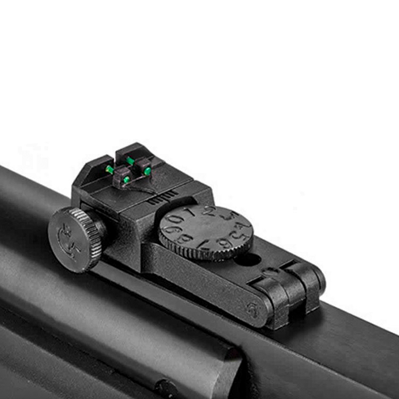 Alça de mira com ajuste vertical e horizontal, trilho (11mm e 22mm) e trava para luneta.