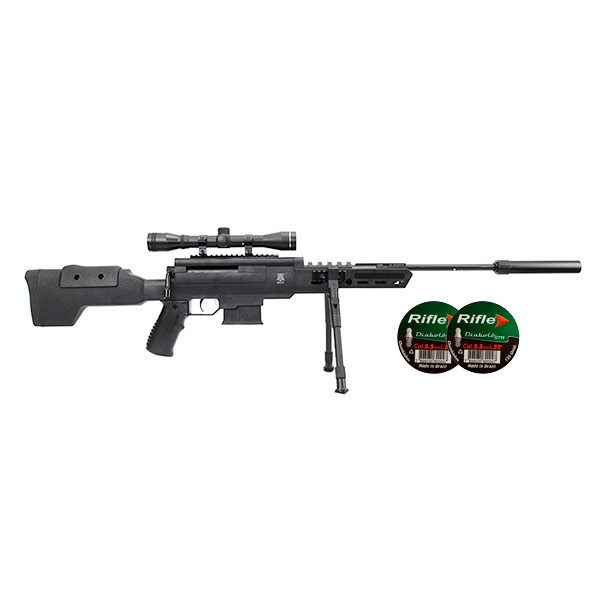 Acompanha duas latas de chumbinho para calibre 5.5mm.