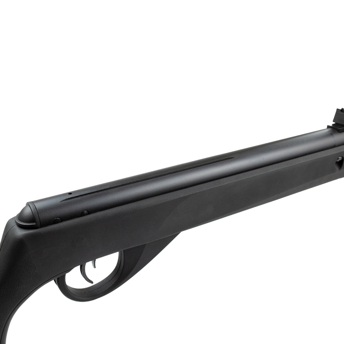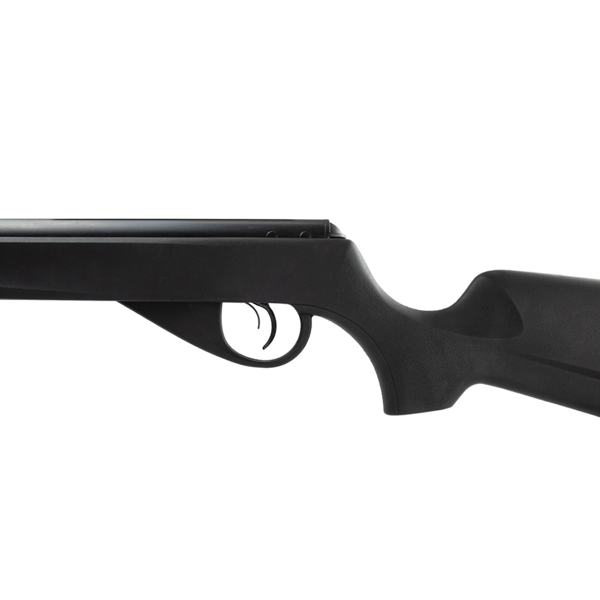 Possui gatilho em metal e cano em aço com alma raiada.