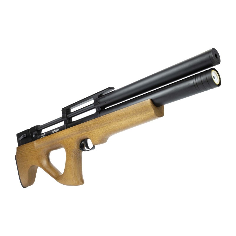 Carabina PCP (Pre Charged Pneumatic) com coronha em madeira, modelo P15 Killer com sistema de configuração BullPup.