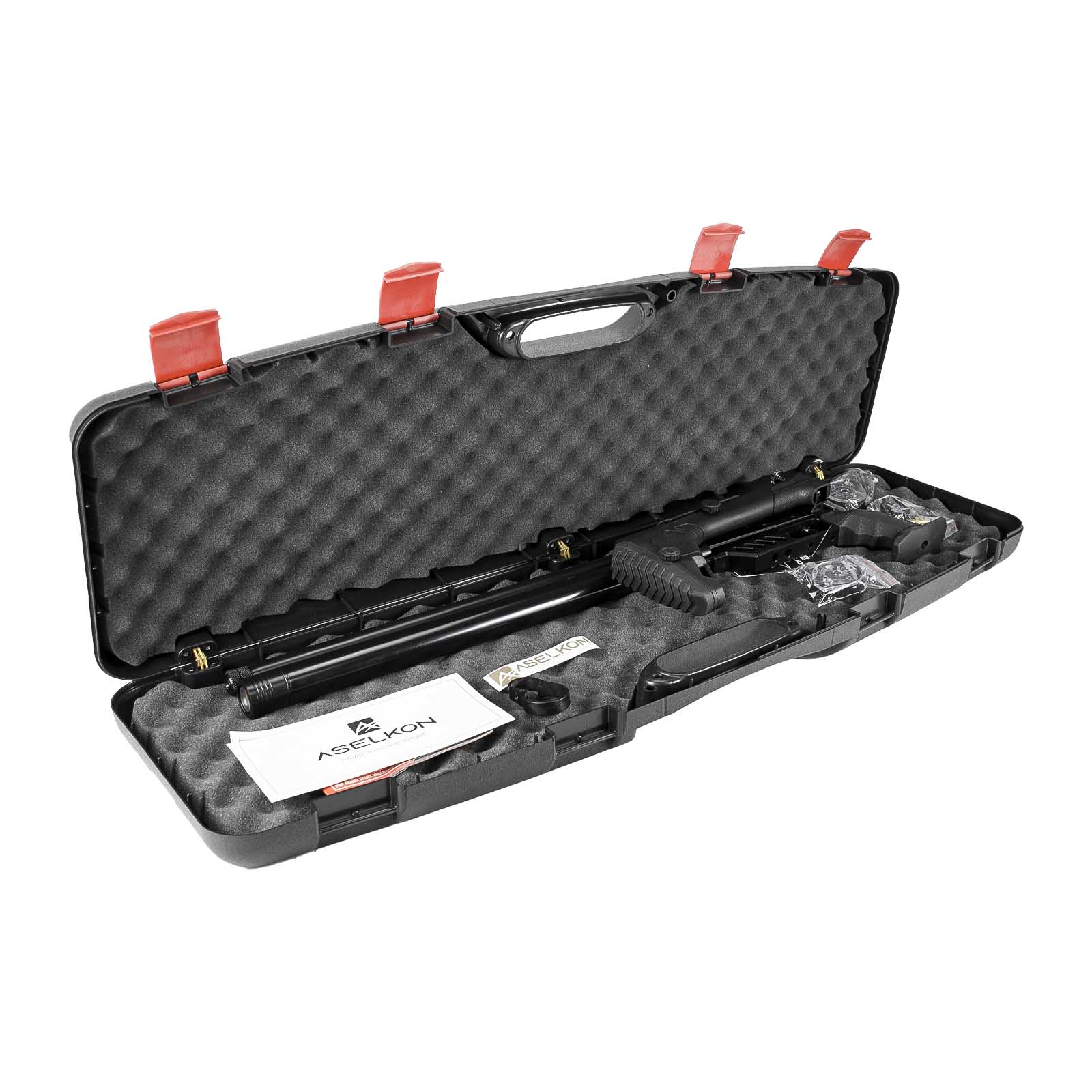 Acompanha case rígido personalizado Aselkon para transporte e armazenamento seguro da sua Carabina PCP. É um case muito bonito na cor preta e com detalhes em vermelho.