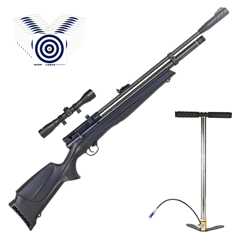 KIT especial para você! Conta com Bomba Manual PCP 300 BAR para encher o cilindro da sua carabina, Luneta 4x32 Sport Rossi e Alvos de Treino Rossi.
