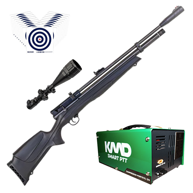 Combo especial para você! Com Compressor de Ar Portátil KWD para facilitar seu trabalho ao completar o cilindro da sua carabina, Luneta 6-24x50 Rossi para melhorar seu desempenho ao mirar e Alvos de Treino Rossi.