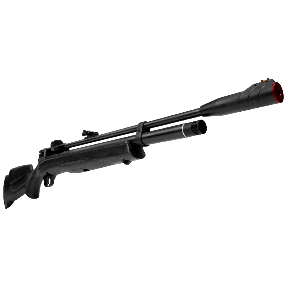 O engatilhamento é feito por ação manual através de alavanca, com capacidade para até 9 chumbinhos no calibre 6.35 mm (.25) e autonomia aproximada de 40 disparos por carga, oferecendo boa eficiência para sessões prolongadas de tiro. Seu cano metálico de 557 mm contribui diretamente para a precisão e consistência dos disparos.