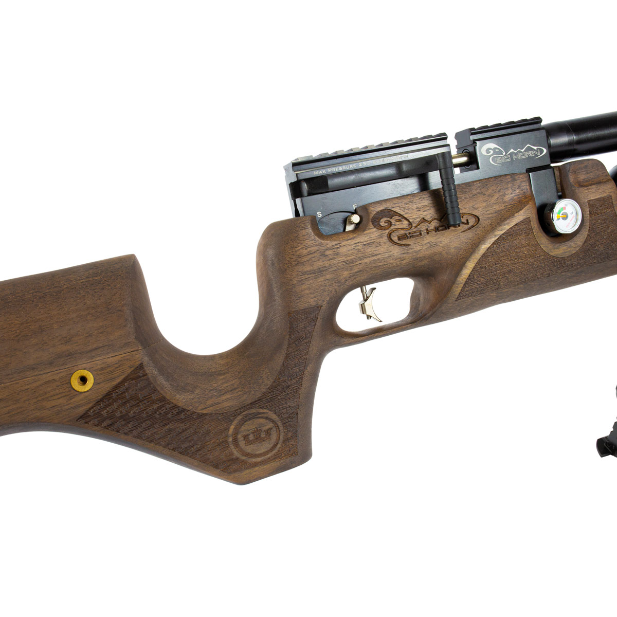 Fabricada na Turquia, a Big Horn 7.62 mm tem sua coronha em madeira feita de Nogueira Turca, sendo assim, cada carabina é única, com uma assinatura única, pois a madeira pode variar de acordo com cada lote.