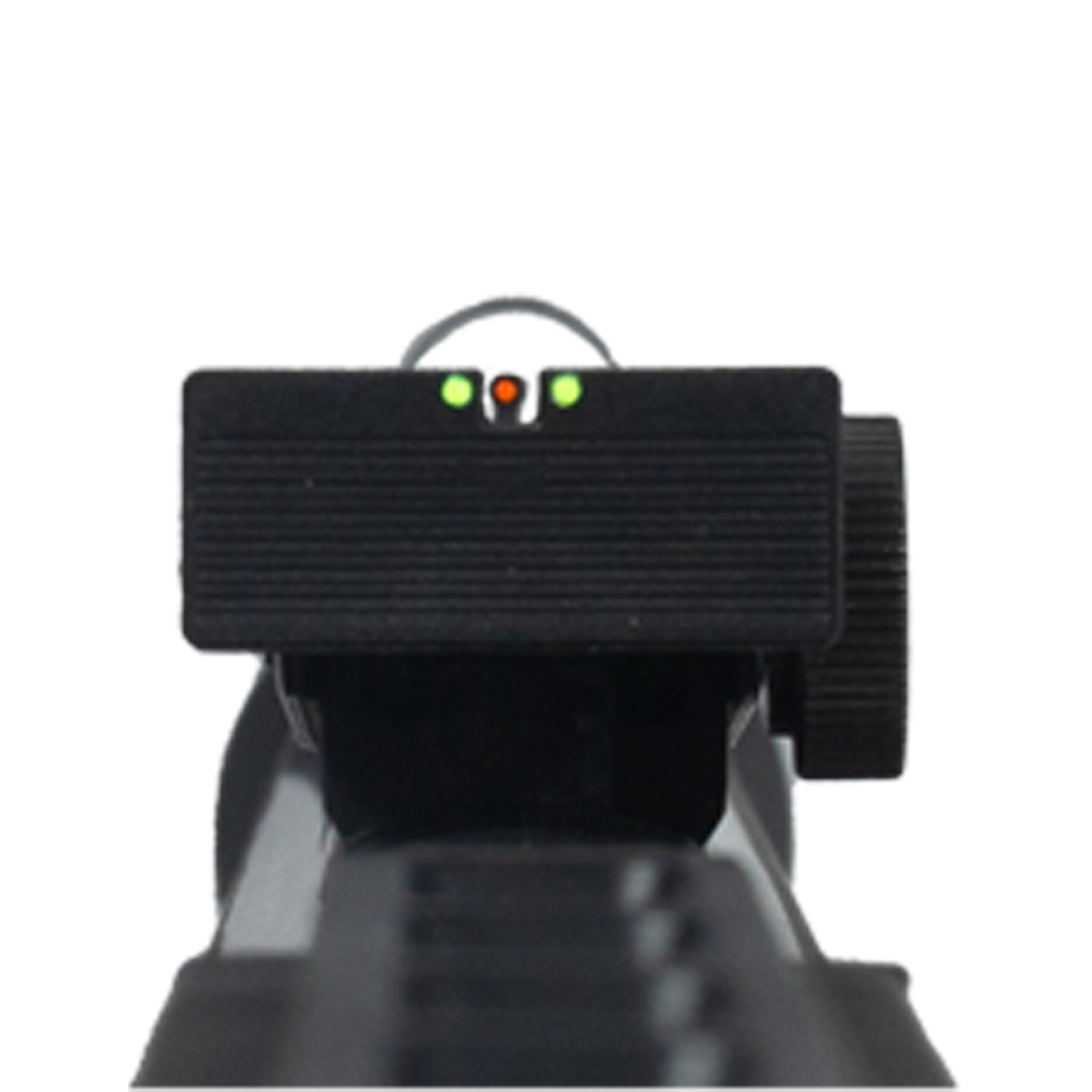Equipada com conjunto de mira aberta com fibra óptica, sendo a alça de mira com ajuste vertical e horizontal e a massa de mira fixa com túnel de proteção.