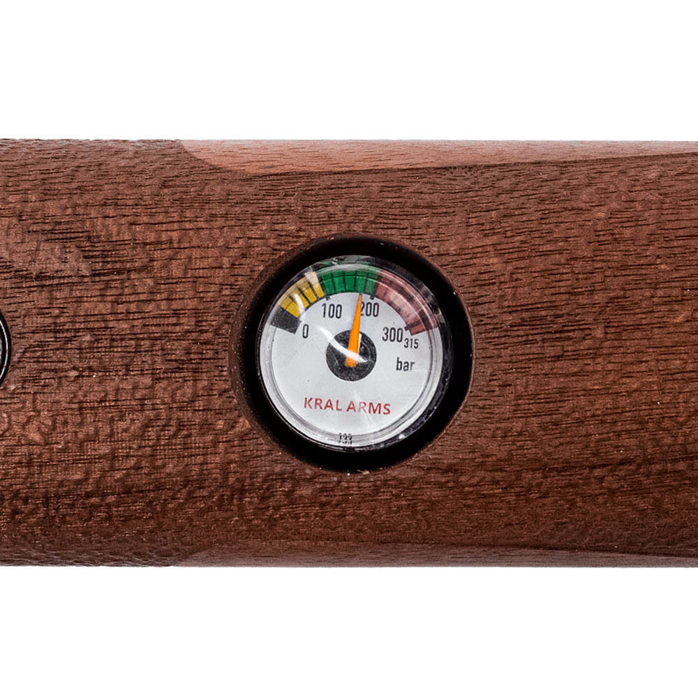 Carabina PCP fabricada na Turquia pela Kral Arms, modelo Puncher Nish com coronha em madeira nogueira. Uma Carabina de Pressão ideal para caça, tiro recreativo e esportes. Extremo impacto e precisão com excelente custo-benefício. Com sistema de propulsão PCP (Pre Charged Pneumatic), possui cilindro de 280 cc que trabalha com pressão de 200 bar e conta com ajuste de pressão. Entrega uma autonomia de aproximadamente 96 disparos por carga completa do cilindro. Possui manômetro integrado.
