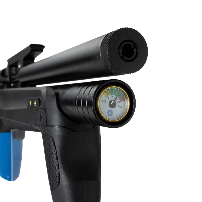 Equipada com um cilindro de ar de 265 cc que tem uma pressão máxima de trabalho de 200 Bar. Esse cilindro em carga máxima, oferece uma autonomia de aproximadamente 75 disparos.