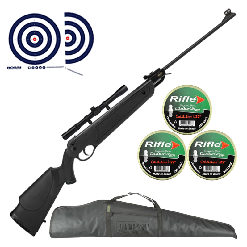 Combo completo! Contém Luneta 4x20 Thunder Outdoors para melhorar seu desempenho de precisão, Capa Universal Loja Da Carabina para armazenar sua carabina com mais segurança, Chumbinhos Rifle Diabolo para municiar sua arma e Alvos de Treino Rossi.
