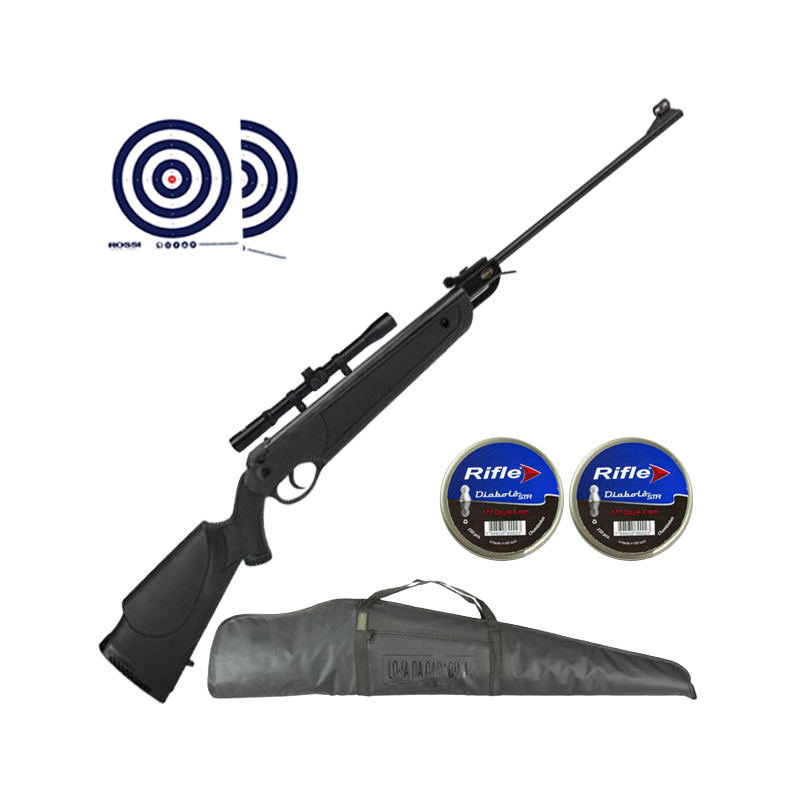 CARABINA DIONE 4G 4.5MM + LUNETA 4X20 + CAPA LC + CHUMBINHOS 4.5MM + ALVOS ROSSI