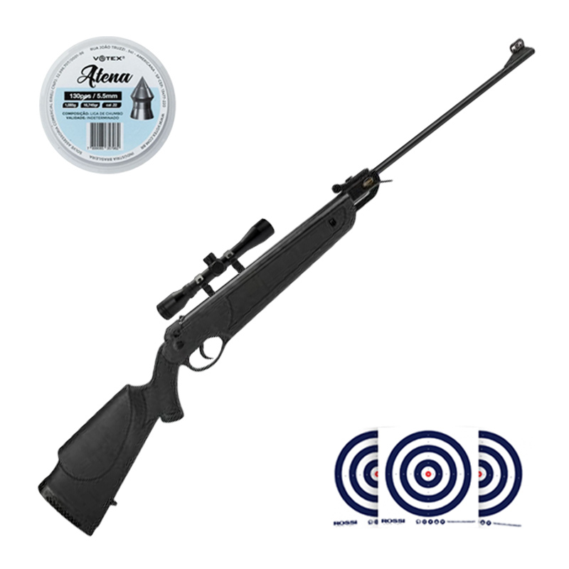 Combo criado pela LC, com Luneta 4x32 Rossi para melhor visada do alvo, Chumbinho Atena Votex 5.5mm para municiar sua carabina e Alvos de Treino Rossi.