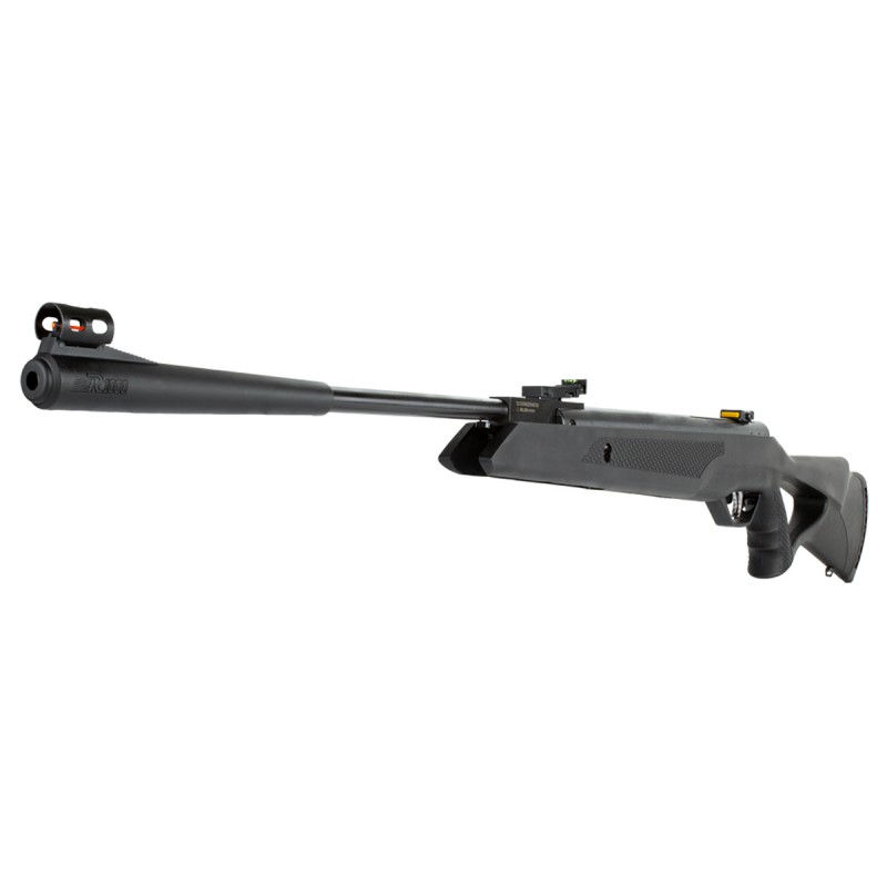 Carabina de Pressão 5.5 com gás ram (Nitro), com coronha de polímero ambidestra tipo Montecarlo com abertura na coronha para encaixe do dedo polegar.