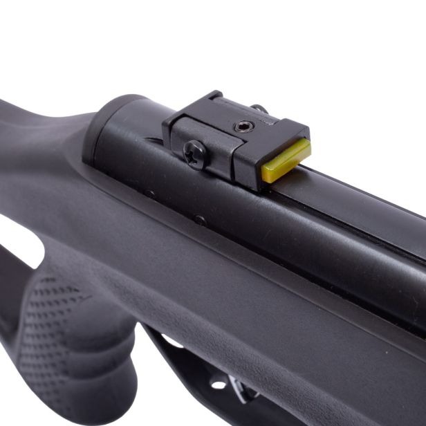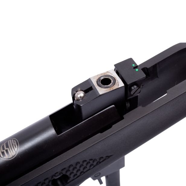 - Mira: Truglo com fibra óptica, alça com regulagem e massa de mira protegida por túnel