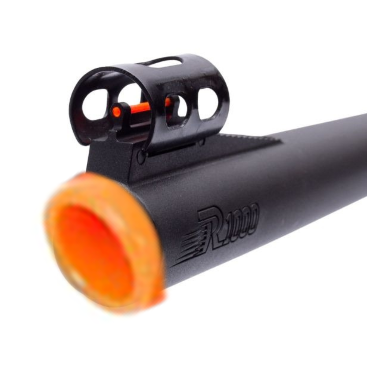 A coronha thumbhole vazada, fabricada em polímero de alta resistência, proporciona empunhadura firme, confortável e anatômica, permitindo controle superior durante o disparo. A R1000 conta com conjunto de mira truglo com fibra óptica, oferecendo visada nítida mesmo em condições de pouca luz. A alça possui ajustes de altura e lateralidade, enquanto a massa é fixa e protegida por túnel. O modelo também dispõe de trilho de 11mm para instalação de acessórios ópticos, como lunetas e red dots.