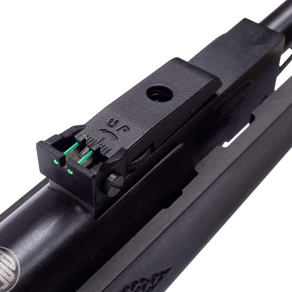 - Mira: Truglo com fibra óptica, alça com regulagem e massa de mira protegida por túnel