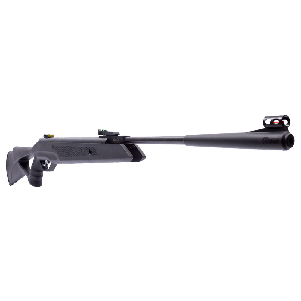 A Carabina de Pressão Rossi R1000 Gas Ram 6.35 dispara tiros com muito impacto, em uma velocidade que atinge os 200m/s gerando potência e uma boa pressão, possui na ponta do cano um ótimo Muzzle Break que vai auxiliar no basculamento do cano.