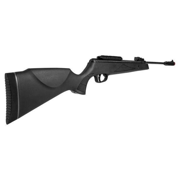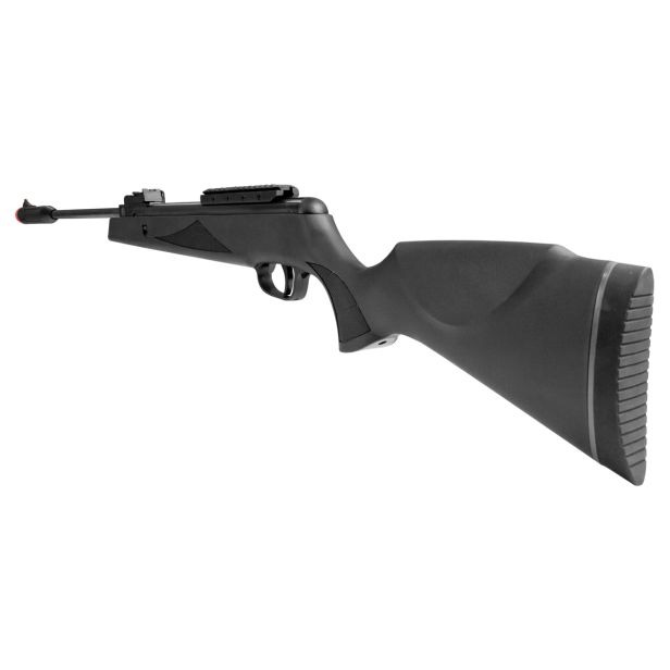Seu design ergonômico conta com coronha estilo Montecarlo em polímero reforçado, oferecendo resistência, leveza e conforto mesmo durante longas sessões de tiro. A soleira emborrachada ajuda a absorver o recuo, enquanto o Muzzle Break na ponta do cano torna o engatilhamento mais firme, seguro e confortável. O conjunto de mira aberta possui fibra óptica, com alça ajustável e massa fixa, garantindo excelente visibilidade. Para aprimorar ainda mais a precisão, o modelo inclui trilho de 11mm com adaptador para 22mm, permitindo o uso de diversos tipos de miras.