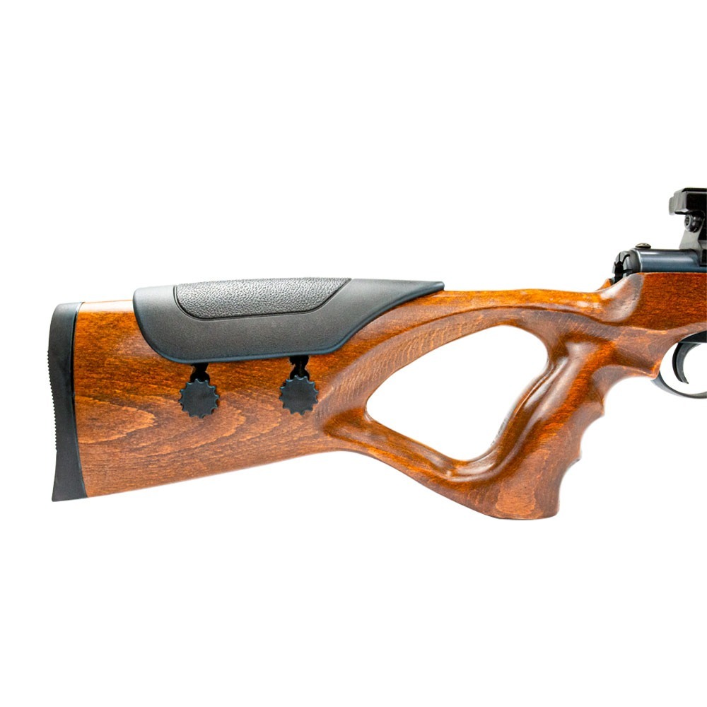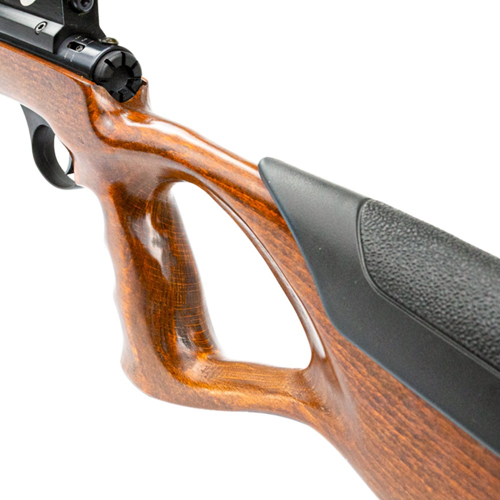 Seu design se destaca pela coronha em madeira natural no estilo thumbhole, que oferece ergonomia superior e maior estabilidade durante o disparo. O formato vazado permite uma empunhadura mais firme e confortável, favorecendo maior controle e precisão. Além disso, conta com apoio de bochecha ajustável em polímero, permitindo adaptar a altura para um alinhamento perfeito com a mira.