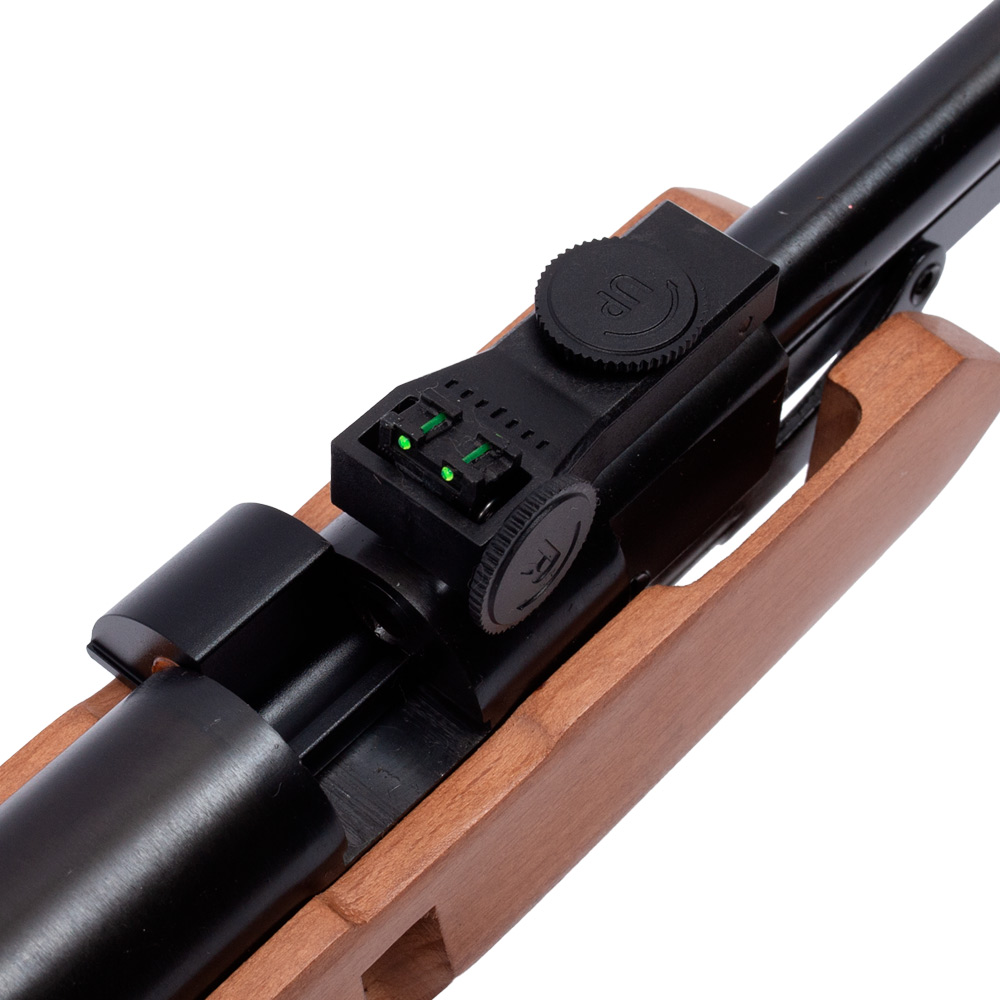 Equipada com conjunto de mira aberta com fibra óptica, sendo a massa de mira fixa e a alça de mira micro ajustável com ajuste vertical e horizontal.