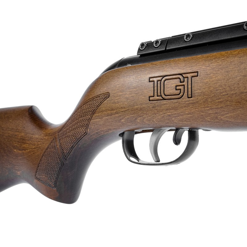 Carabina com sistema nitro IGT com gás ram de 60kg instalado de fábrica. Esse sistema torna a carabina mais precisa, além de oferecer maior conforto ao atirador, menor vibração e menos esforço para armar a carabina.