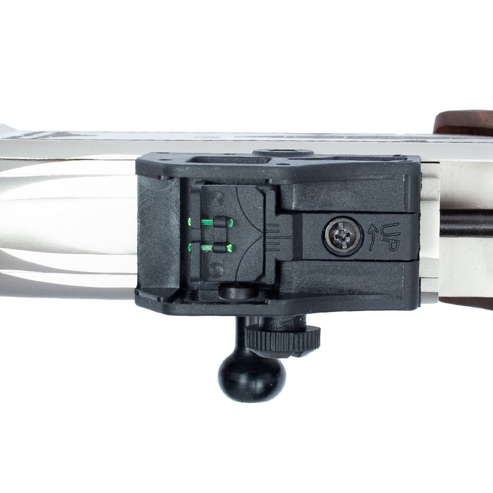 - Alça de mira: Micro ajustável com fibra óptica de 0.9 mm (0.035”) verde