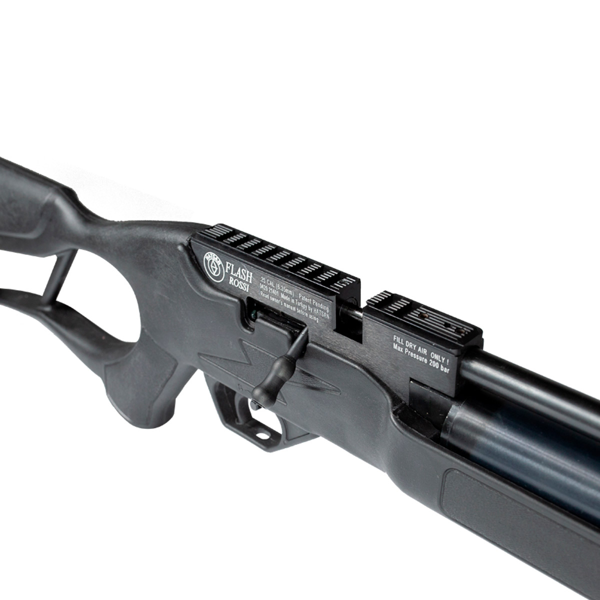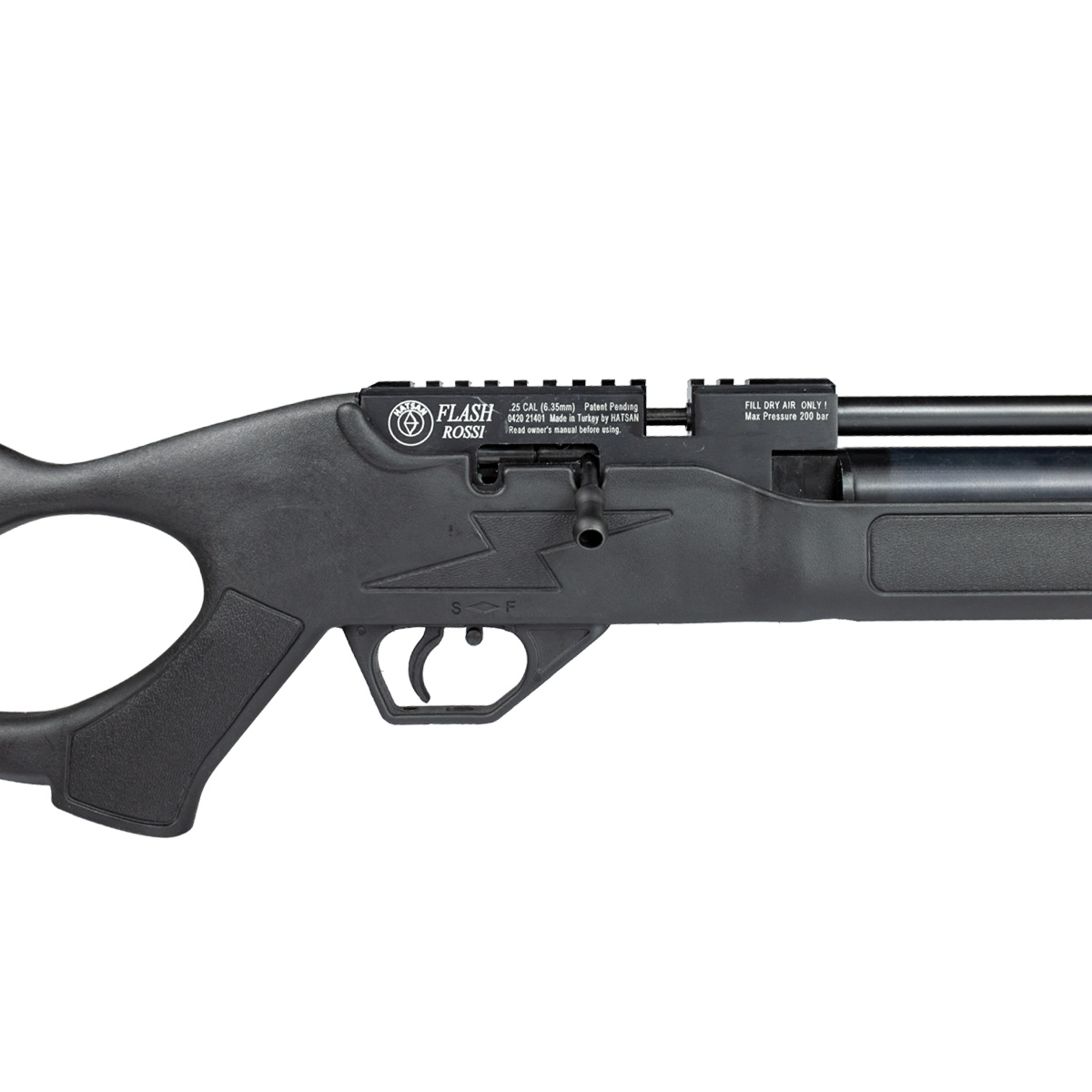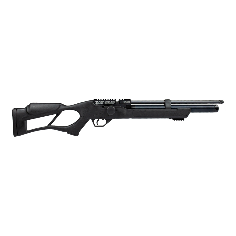 Carabina de Pressão PCP (Pré Charged Pneumatic), fabricada pela Hatsan no calibre 6.35mm é uma linda carabina com velocidade de 265m/s* por disparo que utiliza magazine do tipo tambor rotativo com capacidade para até 10 chumbinhos. O engatilhamento da Hatsan Flash é por ferrolho lateral.