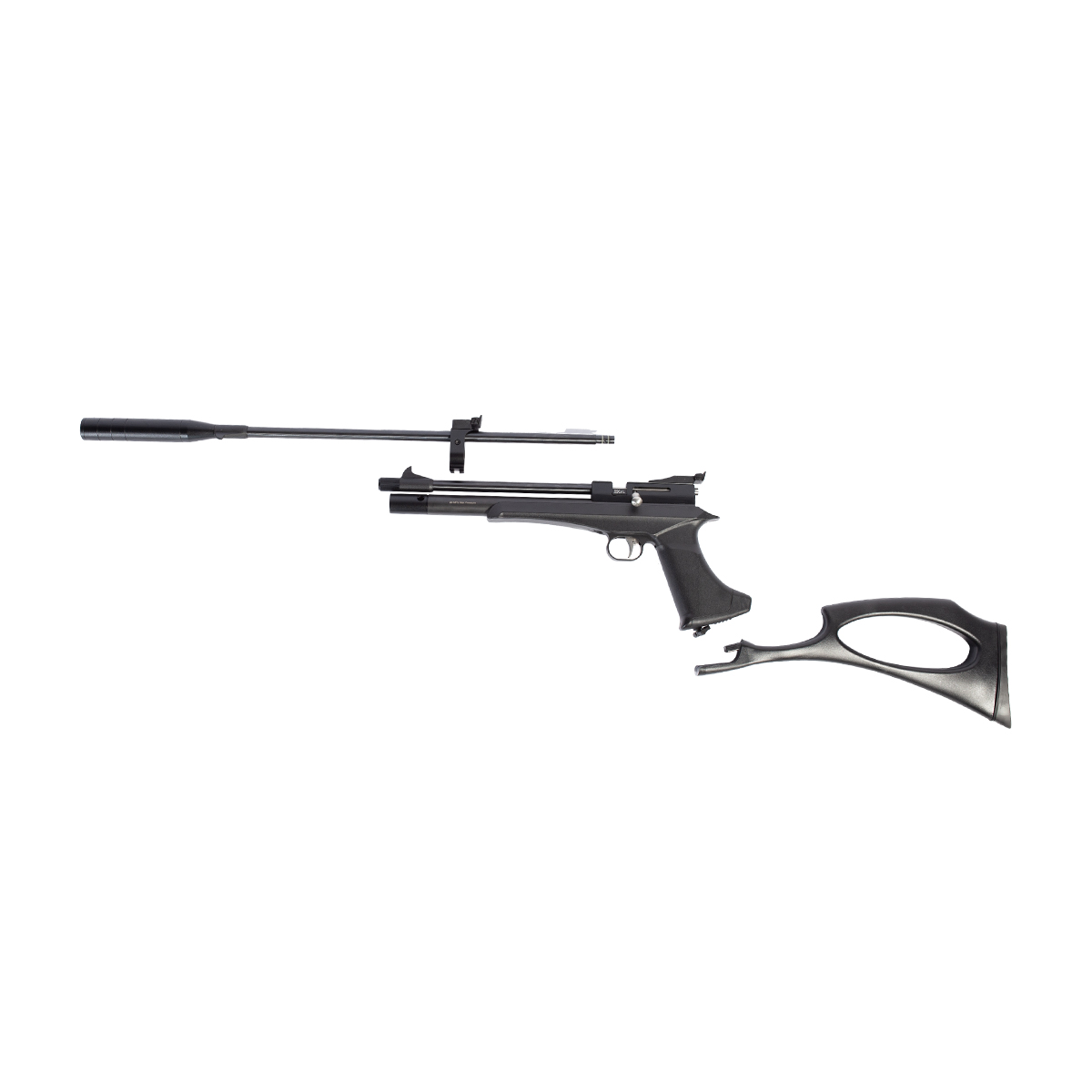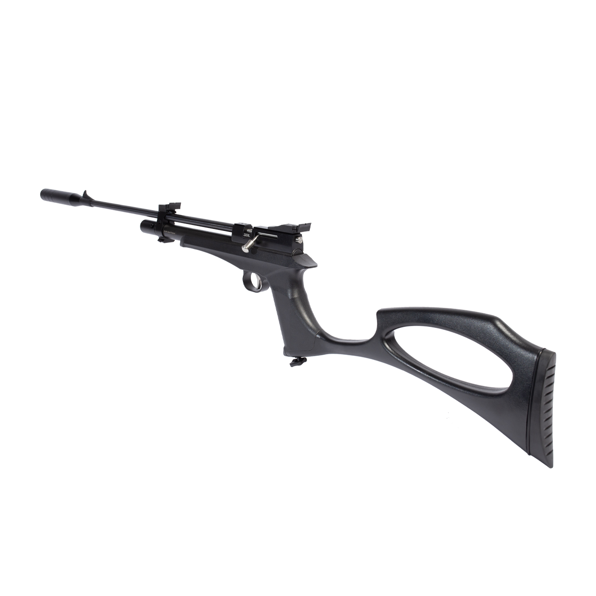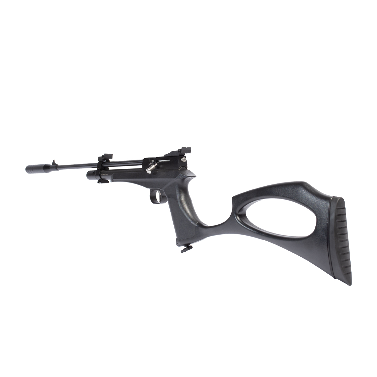 Fabricada em polímero de alta densidade na cor preta e com detalhes em prata, é uma linda arma de pressão PCP.